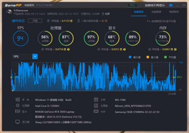 在PUBG中,游戲整體畫質(zhì)設(shè)置為「高」,分辨率1080P,在海島地圖進(jìn)行一場第三人稱的四排游戲,自動(dòng)填充隊(duì)友,死后觀看直到整局游戲決出勝者,整局游戲的平均幀數(shù)為94幀。