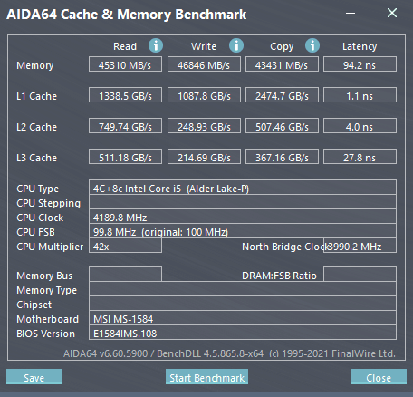 除了處理器的測試外,在內(nèi)存和硬盤方面,微星武士66也展現(xiàn)了不錯(cuò)的性能。首先AIDA64緩存&內(nèi)存測試可見單通道內(nèi)存下,其讀取速度45310MB/s,寫入速度46846MB/s,拷貝速度434317MB/s,延遲94.2ns。低延遲以及較高的讀寫拷貝速度,使得該款游戲本在實(shí)際應(yīng)用過程中不會(huì)感到卡頓。