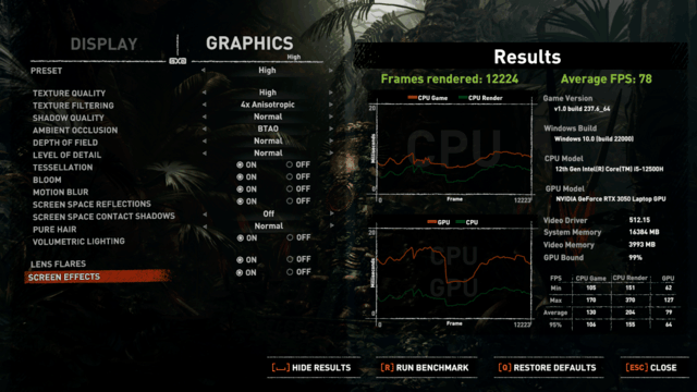 在古墓麗影中,1080P分辨率,關(guān)閉垂直同步,整體畫質(zhì)設(shè)置為High,運(yùn)行游戲內(nèi)的BenchMark,平均幀數(shù)為78幀。