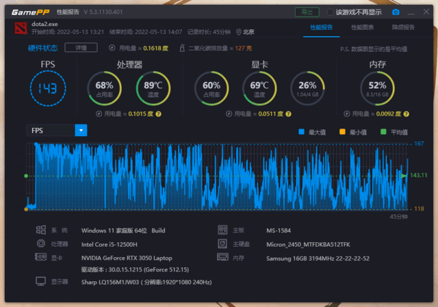 在DOTA2中,畫面整體設(shè)置為最高,分辨率1080P,在首頁選擇一場剛剛開始的對局,自動(dòng)視角,整局游戲的平均幀數(shù)為143幀。
