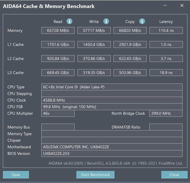 使用aida64內存和緩存基準測試這兩種內存的性能。讀取、寫入和復制速度分別為65,728 MB/s、57,717 MB/s和66,820 MB/s,延遲110.4ns。