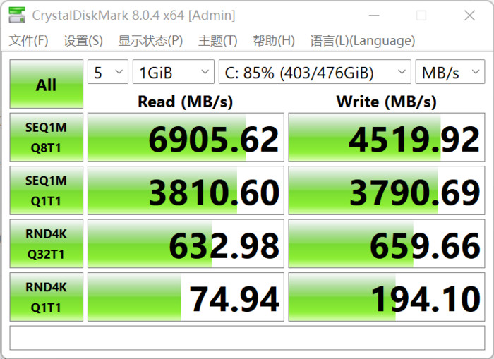 之前我們對硬盤做過跑分測試,讀取速度為6905.62MB/s,寫入速度為4519.92MB/s,這個成績在PCIe 4.0的硬盤里也屬于第一梯隊了。