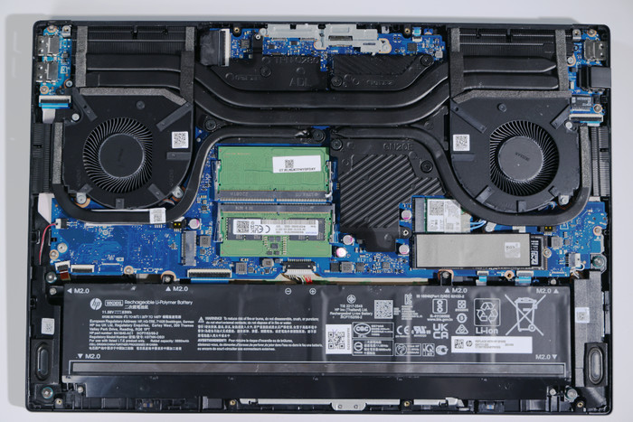 將螺絲卸下來以后就可以用撬棒將背板翹起了,OMEN暗影精靈8 Pro的背板是由一整塊復合材料制成,因此撬開背板的時候一定要慢,而且背板上的卡扣比較多,切忌大力出奇跡。背板拆下來以后就能看到機身內部構造了,布局也是比較規整:風扇、熱管、電池、雙內存雙硬盤擴展位等一目了然。