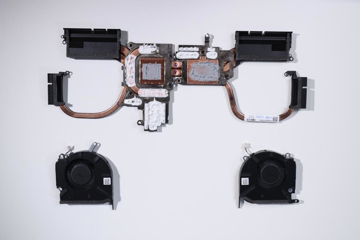繼續拆散熱模組,散熱器沒有與風扇集成在一起,是可以單獨拆下來的,方便分開清灰。OMEN暗影精靈8 Pro在散熱系統方面進行了強勢升級,風扇采用創新的Y形扇葉設計,可以讓葉片密度提升30%以上,從而大幅提升空氣導通性,搭配12V三相馬達和液態軸承,能夠做到高效低噪;這臺機器配置有五根熱管,其中兩根8mm主熱管,總熱管長度較上一代增加22%,散熱鰭片總數達到了206片,屬于游戲本中的豪華配置。