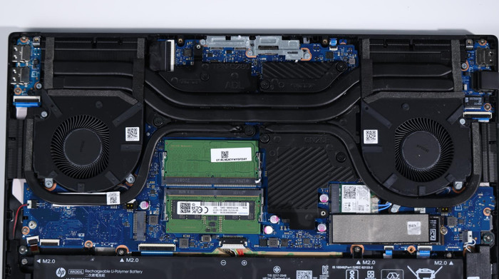 OMEN暗影精靈8 Pro機身內部有兩個內存插槽,可以組建雙通道內存,內存槽兩側有彈性卡扣,拆卸時可以直接用手將兩側卡口向外輕推,隨后即可取出。