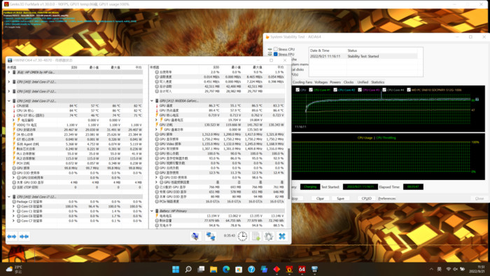日常使用環境下,很難讓處理器和顯卡一直保持滿負載狀態,所以我們通過使用Furmark+AIDA64 FPU對OMEN暗影精靈8 Pro進行35分鐘雙烤測試,模擬極端滿負載運行環境,從而考察硬件最高的性能輸出以及散熱系統的抗壓表現。