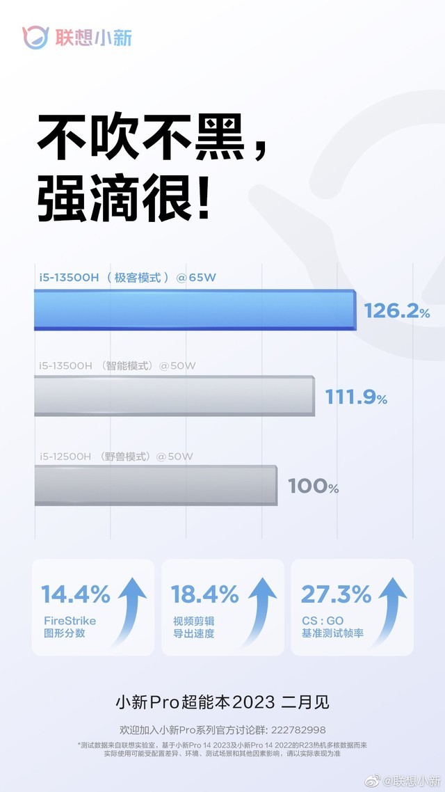 據聯想官方消息,2023 款小新 Pro 筆記本將在 2 月發布,新款小新 Pro 筆記本的 i5-13500H 處理器可實現 65W 性能釋放,比上代 50W 性能釋放的 i5-12500H 性能提升 26%。