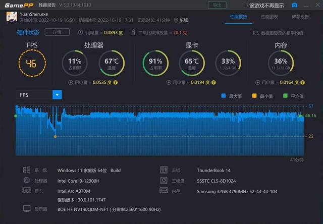《原神》中等畫質中全程幀率46,基本也算是流暢的范疇。